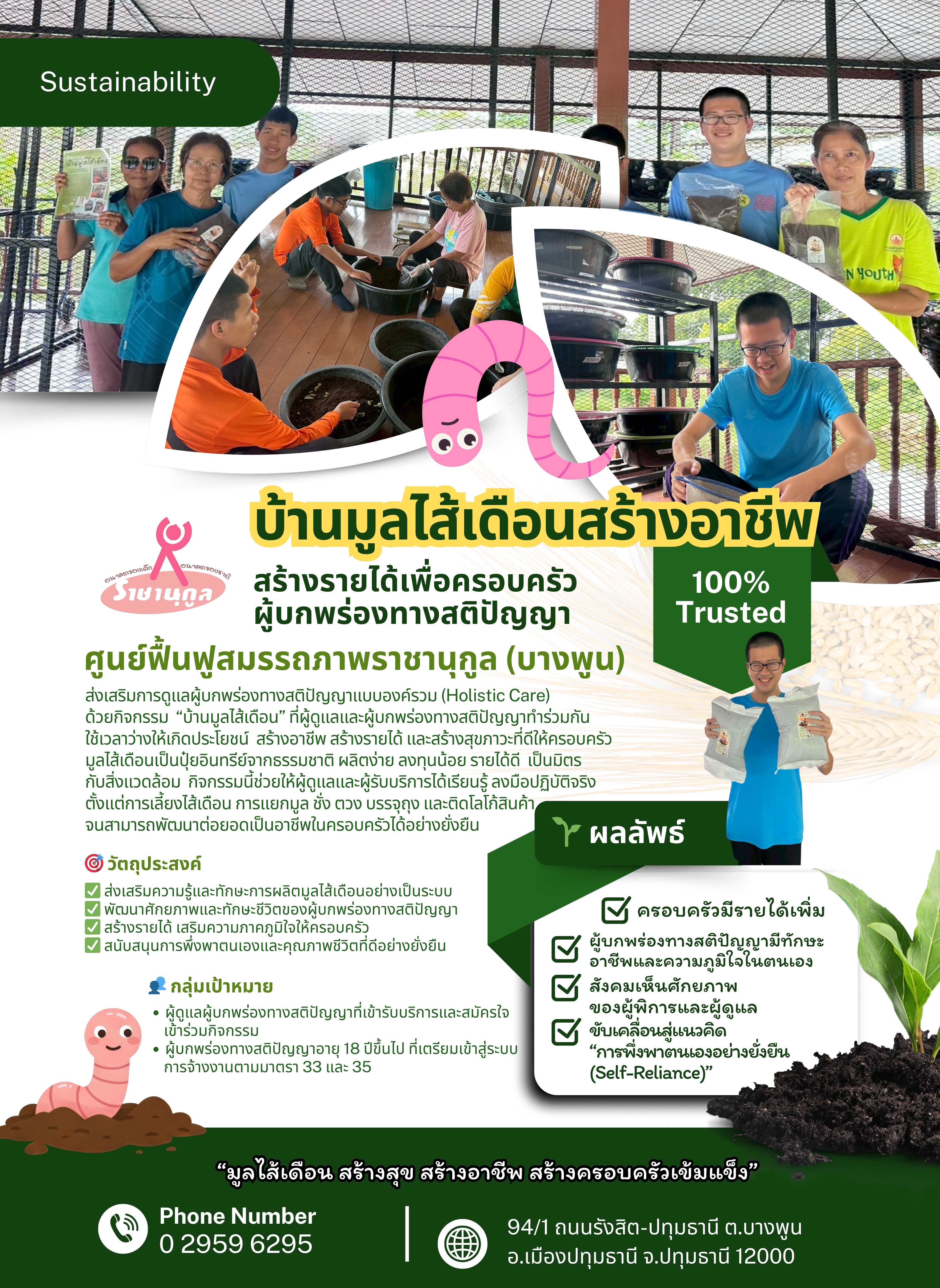 เปิดโอกาสให้ผู้ปกครองและผู้บกพร่องทางสติปัญญาที่ไม่สามารถเรียนต่อได้ แต่ต้องการมีอาชีพหรือรายได้เสริม เข้าร่วมกิจกรรม เรียนรู้การเลี้ยงไส้เดือนและการผลิตมูลไส้เดือน เพื่อพัฒนาต่อยอดเป็นอาชีพในอนาคตได้แบบ ไม่มีค่าใช้จ่าย
